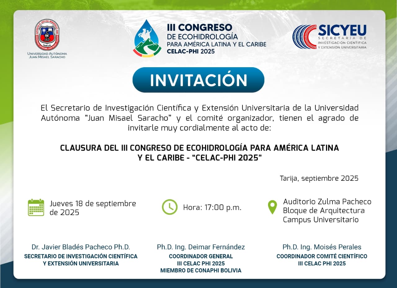 Nos complace anunciar que este importante evento internacional, se celebrará por primera vez en Bolivia, un país lleno de diversidad natural y cultural. Este es el III Congreso de Ecohidrología para América Latina y el Caribe convocado por el Programa Hidrológico Intergubernamental (PHI) de la UNESCO y organizado por la Universidad Autónoma Juan Misael Saracho de Tarija y el CONAPHI-Bolivia.