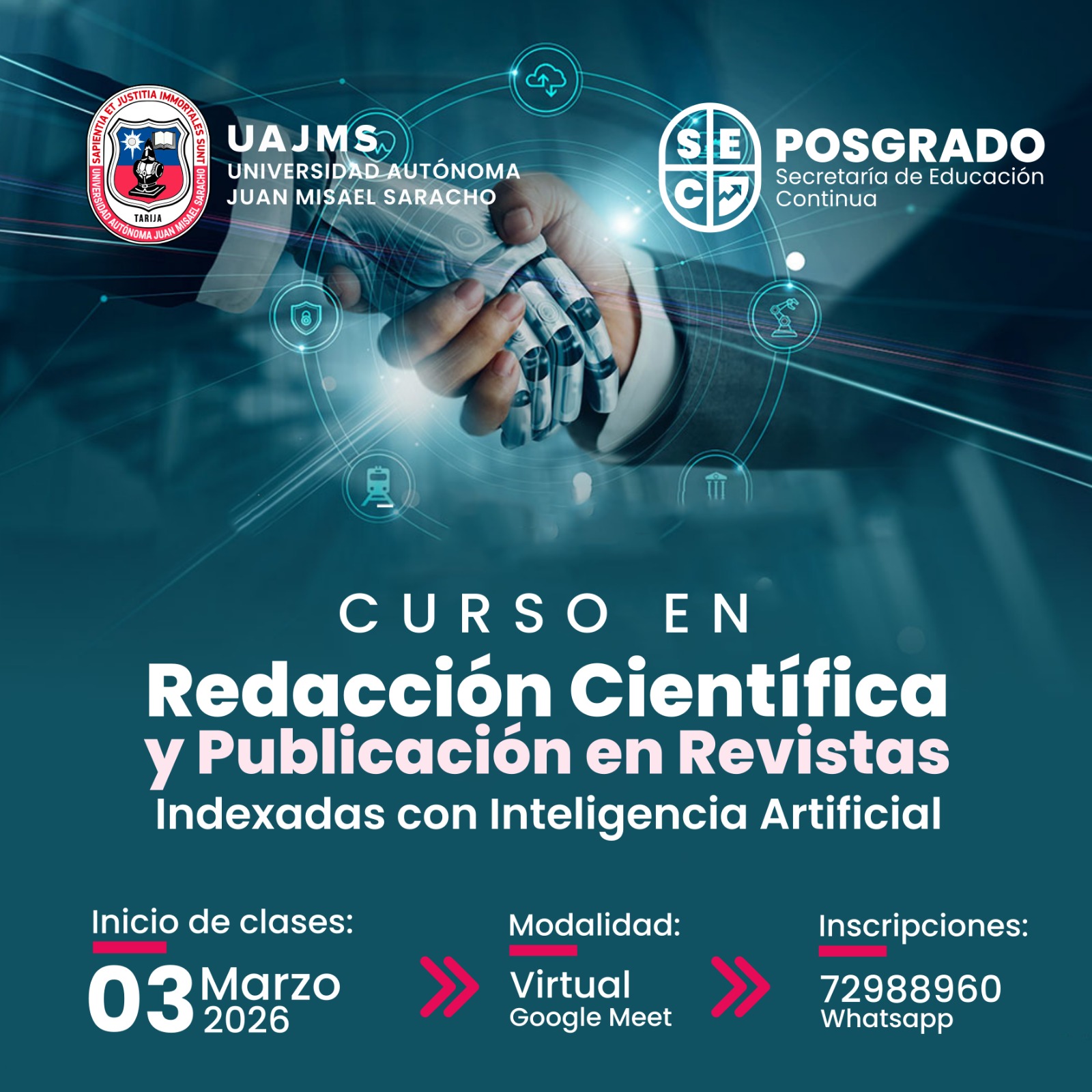El curso «Redacción Científica y Publicación en Revistas Indexadas con Inteligencia Artificial» está diseñado para investigadores, docentes y profesionales interesados en mejorar sus habilidades de escritura académica y optimizar el proceso de publicación en revistas indexadas. Se abordarán herramientas de Inteligencia Artificial (IA) que pueden facilitar la redacción, revisión y selección de revistas adecuadas, maximizando las oportunidades de aceptación de los artículos científicos.